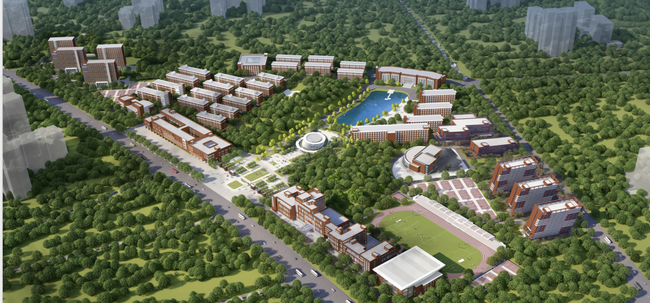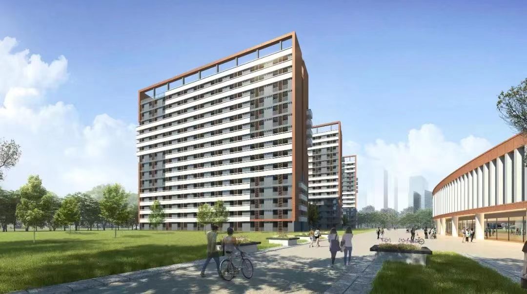 以下是項目鳥瞰圖、21#、22#、23#學生公寓效果圖以及食堂效果圖